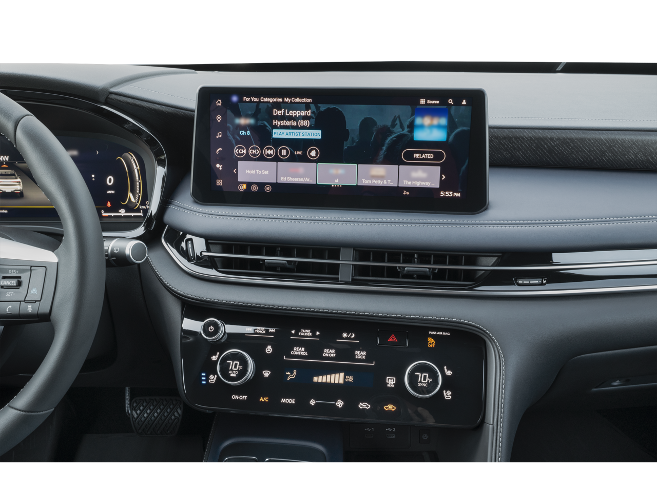 - Radio: Klipsch Premium Audio System -inc: 16 speakers w/subwoofer, INFINITI InTouch 12.3" interactive display, Google built-in w/navigation: Google Assistant, Playstore, maps and data, SiriusXM satellite radio, wireless Apple CarPlay, wireless Android Auto, advanced voice recognition (one shot VDE, Natural Language Understanding (NLU)), INFINITI InTouch services and 5G Wi-Fi hotspot, Active Noise Cancellation (ANC) and 2 data capable type C USB ports in front row