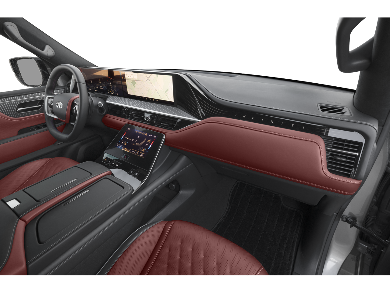 Leather Seats, Third Row Seat, Navigation, Sunroof, Panoramic Roof, 4x4, Quad Bucket Seats, Power Liftgate, Rear Air, Heated Driver Seat. Rear Spoiler, MP3 Player, Remote Trunk Release, Privacy Glass. INFINITI AUTOGRAPH with Dynamic Metal/Black Obsidian exterior and Burgundy interior features a V6 Cylinder Engine with 450 HP at 5600 RPM*. Remainder of Factory Warranty Spotless