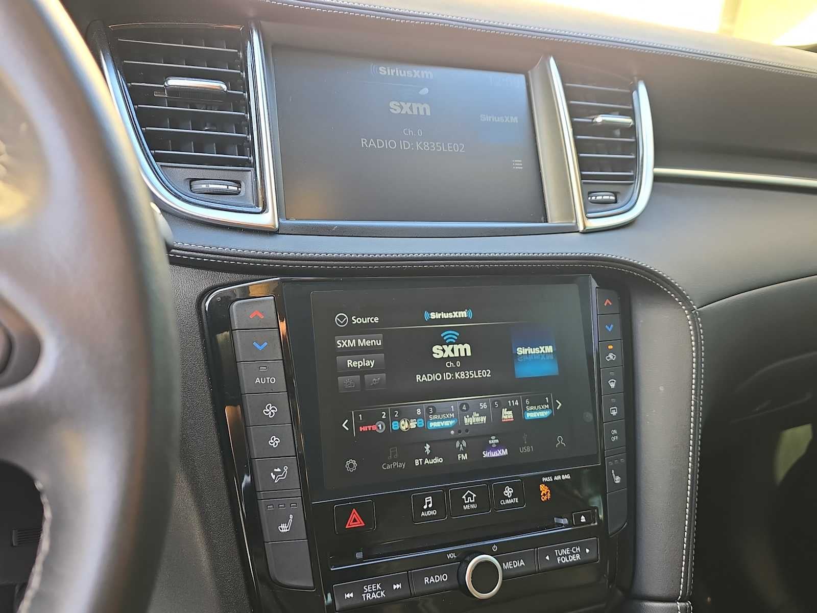- Radio: HD Audio System -inc: 6 speakers, INFINITI InTouch, INFINITI InTouch services, INFINITI InTouch dual display system w/upper 8" and lower 7" HD touch screens, wireless Apple CarPlay, Android Auto, HD Radio technology, SiriusXM radio w/advanced audio features and 90-day complimentary trial, SiriusXM Travel Link w/90-day complimentary trial, INFINITI voice recognition, Siri Eyes Free, Wi-Fi hotspot, active noise cancellation, Bluetooth® hands-free phone system and streaming audio via Bluetooth®