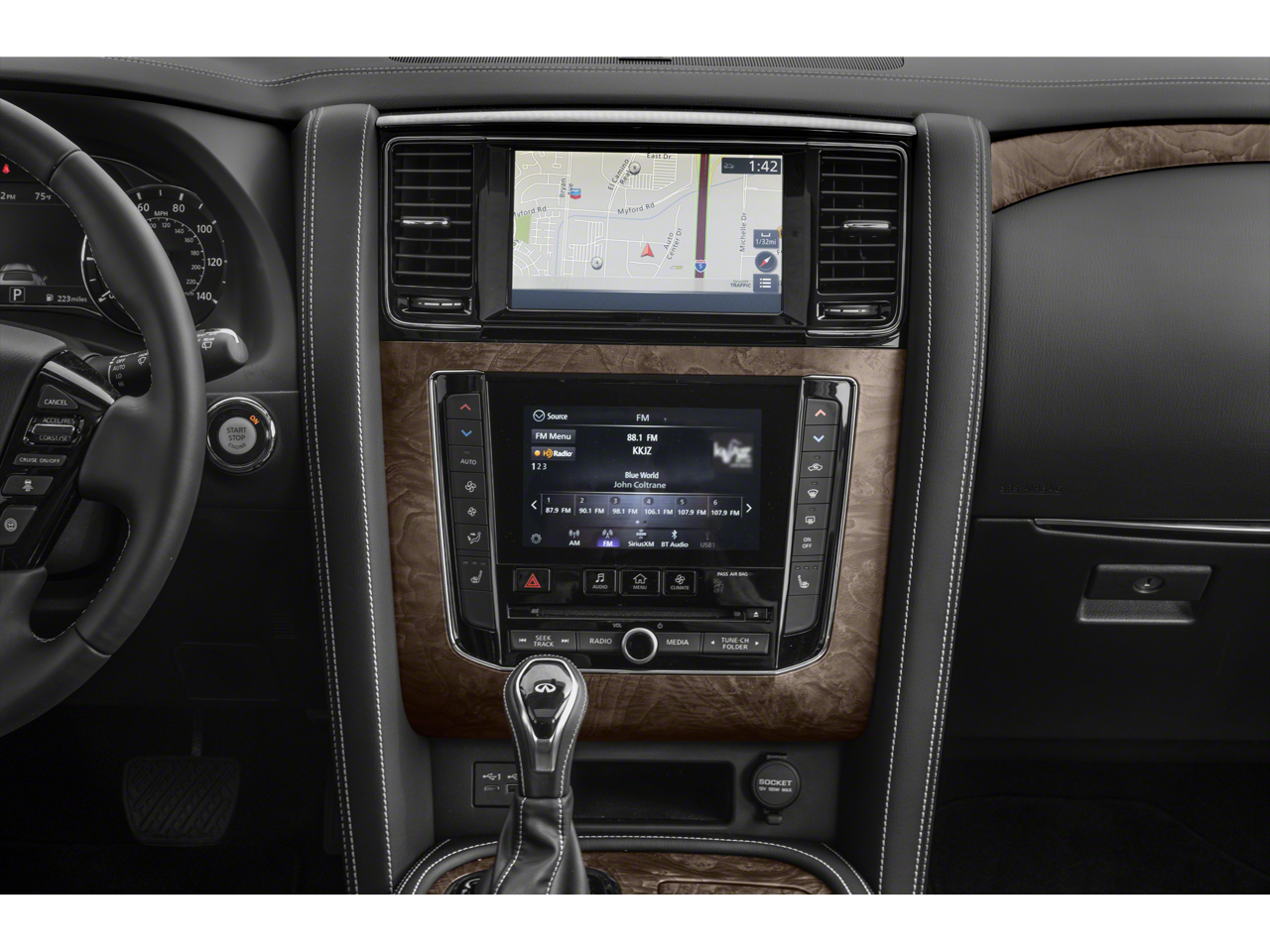 - Radio: Bose Premium Audio System w/13 Speakers -inc: driver's audio stage, speed-sensitive volume control, INFINITI InTouch 12.3" interactive display, INFINITI InTouch services (1-year premium trial and 5-year select trial), INFINITI navigation w/lane guidance and 3D building graphics, MapCare w/over-the-air update compatibility (5-year trial period), premium traffic w/live traffic information (5-year trial period), TomTom weather (5-year trial period), HD radio technology, Apple CarPlay w/wireless Apple CarPlay integration, Android Auto, Siri Eyes Free, Wi-Fi hotspot (30-day or 1GB trial, whichever comes first), Alexa built-in, SiriusXM radio (3-month trial period), SiriusXM Traffic (3-month trial period), SiriusXM Travel Link (3-month trial period): weather, fuel prices, stock prices, sports scores, movie listings and parking, over-the-air head unit update capability (5-year trial period), INFINITI Voice recognition for audio, navigation, Bluetooth® and vehicle information, Bluetooth® hands-free phone system and streaming audio, hands-free text messaging assistant, 2x USB ports for compatible devices for audio streaming and wireless phone charger