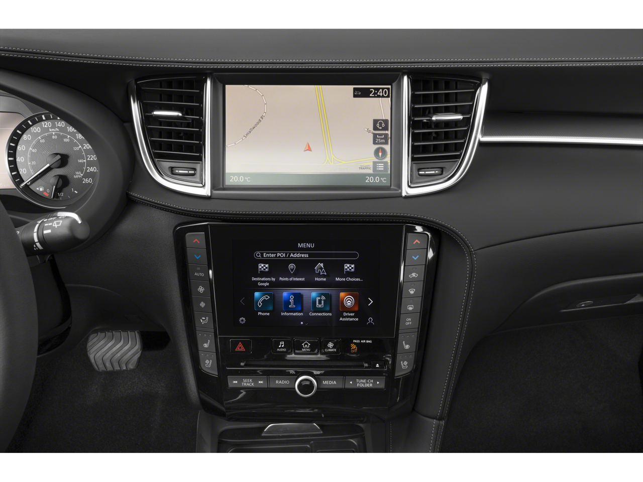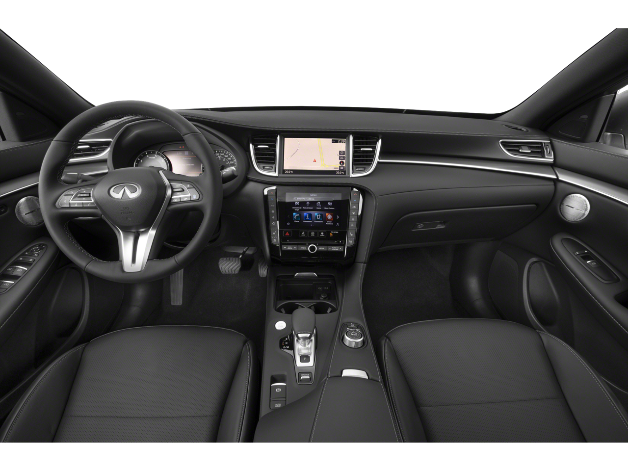 - Radio: Bose Performance Series Premium Audio -inc: 16 speakers, metallic speaker grilles on tweeters, INFINITI InTouch w/navigation and dual display system w/upper 8" and lower 7" touch screens, wireless Apple CarPlay, Android Auto, HD Radio technology, SiriusXM radio w/advanced audio features and 90-day complimentary trial, SiriusXM Traffic w/3-month complimentary trial, SiriusXM Travel Link w/3 months complimentary trial, INFINITI voice recognition, INFINITI InTouch services, Siri eyes free and Wi-Fi hotspot